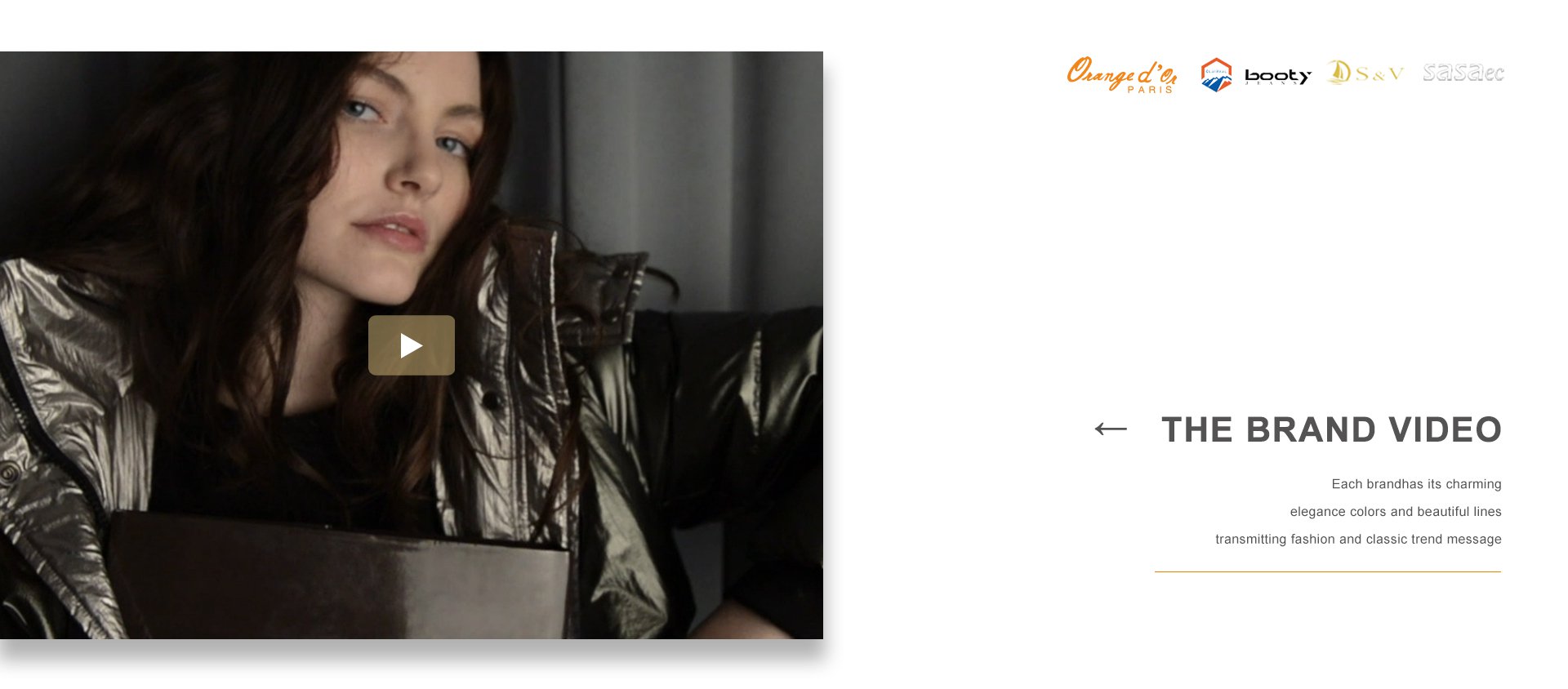 品牌建設是公司堅持不懈的追求,我們每年都會積極參加國內外舉辦的各大服裝展銷會。憑借著良好的質量與信譽,市場占有率在逐漸擴大,產品遠銷歐洲、美洲、亞洲等國。公司以生產棉衣、羽絨服、派克、大衣、夾克、運動休閑服飾等為主,旗下主打品牌有 ORANGE D’OR 、CLAIRVAL、BOOTY JEANS 、S&V和SASAEC,各品牌服飾均以典雅的色彩、優美的線條、卓越的魅力吸引著都市麗人,將時尚、經典的潮流信息予以淋漓盡致的演繹。